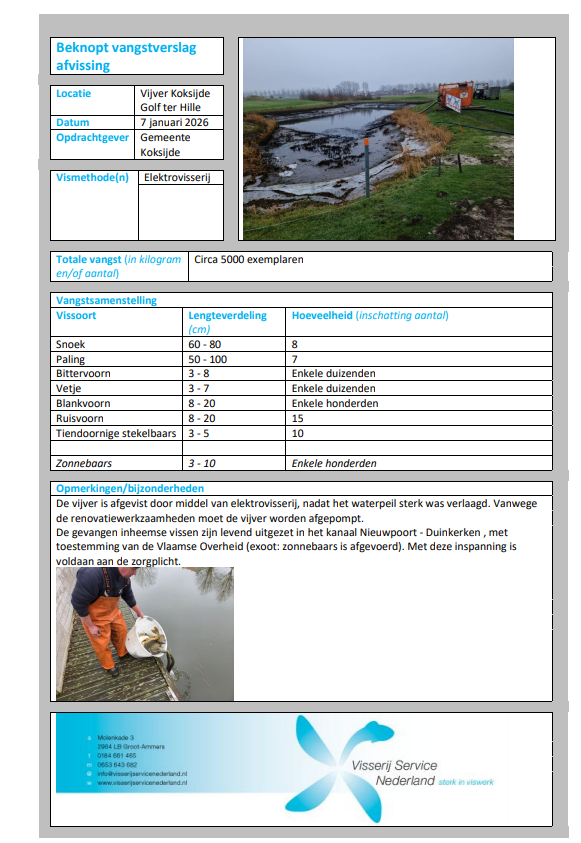 De werken gebeuren in opdracht van het Autonoom Gemeentebedrijf Koksijde (AGB). Voorafgaand aan de drooglegging wordt een professionele visredding en afvissing uitgevoerd, met als doel het aanwezige visbestand maximaal te beschermen.